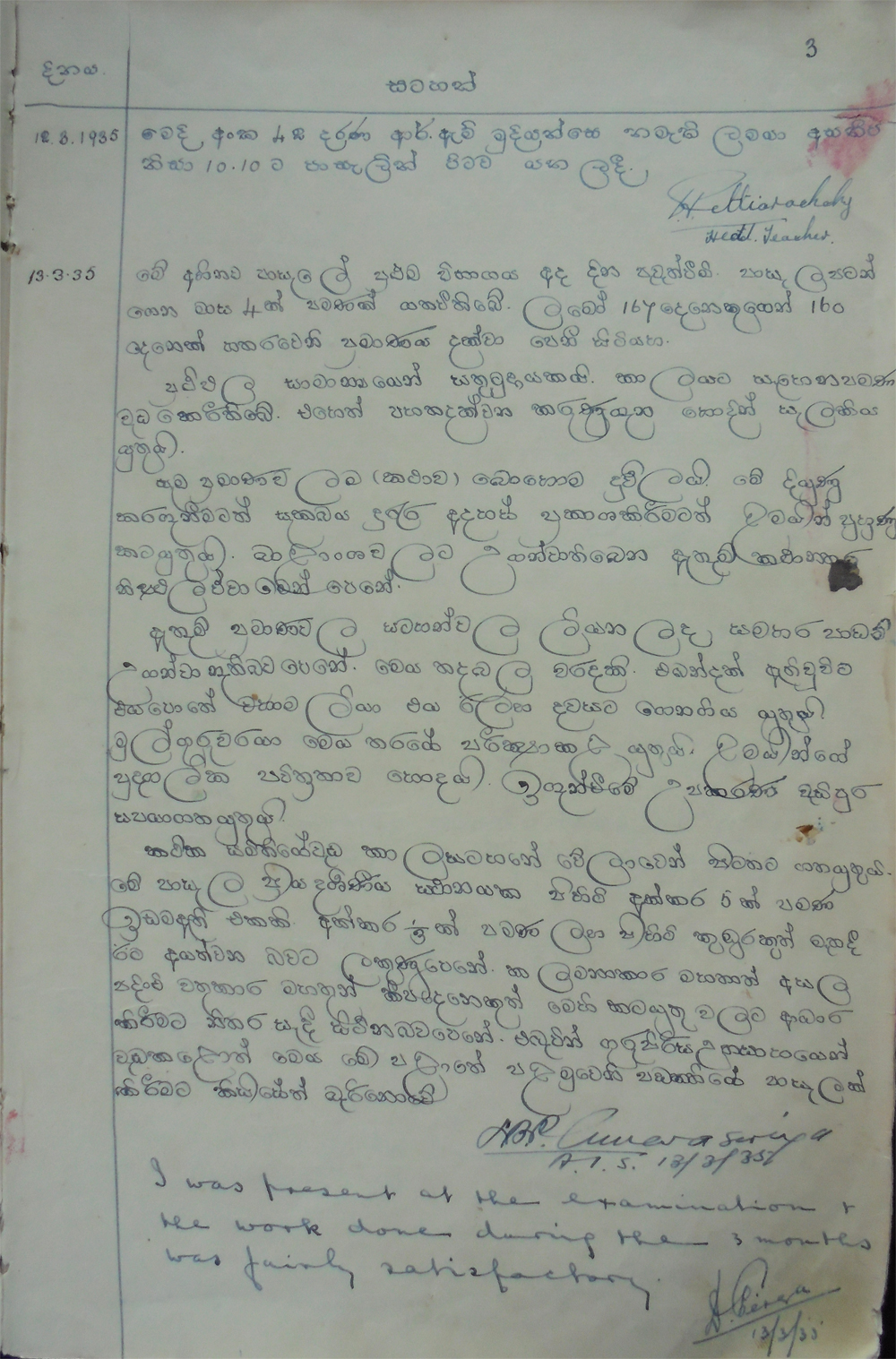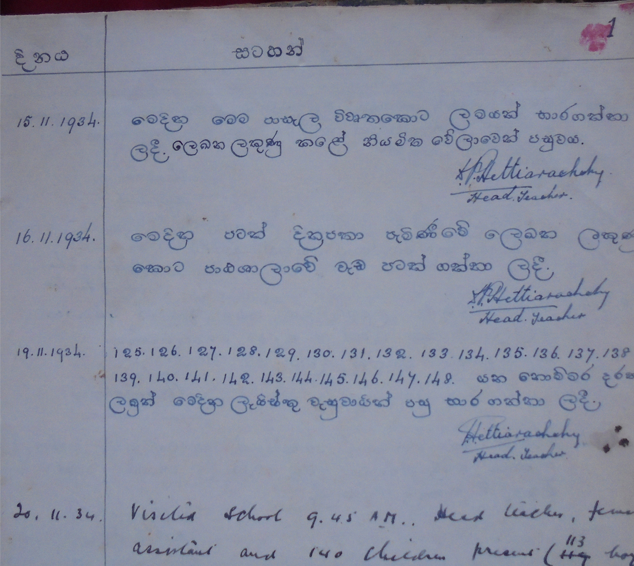 පහත දැක්වෙන්නේ පාසල විවෘත කළ දින හා පසු දිනෙක ලොග් පොතෙහි සටහන් දෙකකි.