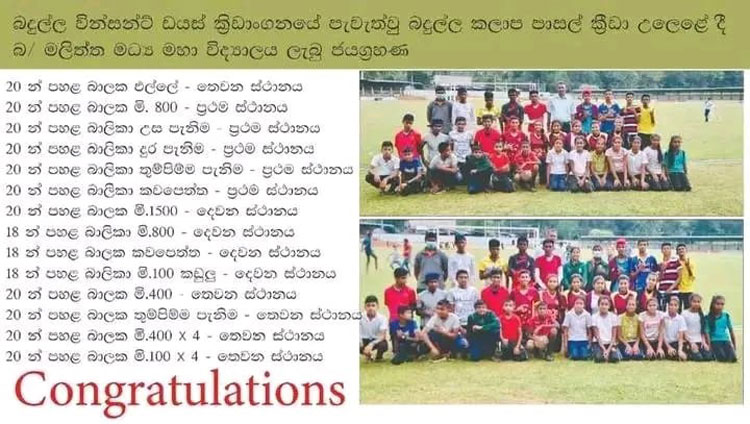 2022 වර්ශයේ කලාප ක්රීඩා තරග පසුගිය අගෝස්තු මාසයේ පැවැත්වුනි.මෙම තරග සදහා බ/මලිත්ත මධ්ය මහා විද්යාලයේ ක්රීඩා අංශය නියෝජනය කරමින් සිසුන් විශාල පිරිසක් ක්රීඩා අංශ භාර ගුරු මෑණියන් වන S.L.වීරසිංහ මියගේ මග පෙන්වීම එයටතේ බදුල්ල විල්සන් ඩයස් ක්රීඩාංගනයේ පැවැත් වු බදුල්ල කලාපීය පාසල් ක්රීඩා උලෙළට සාර්ථකව සහභාගී වුනි. මෙහිදී පැවැත් වු ක්රීඩා තරග වලින් විශාල ජයග්රහණ රාශියක් ලගා කරගැනීමට අප ක්රීඩා අංශයේ ක්රීඩක ක්රීඩිකාවන්ට හැකි විය.ඒවා නම්,